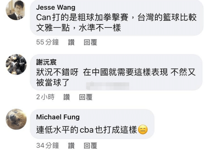 台湾网友看到林书豪的表现之后也纷纷嘲讽,在网络上,他们表示CBA的篮球是粗野和拳击赛,台湾的篮球比较文雅一些,水准不一样。还有网友嘲讽林书豪在低水平的CBA也打成这样?