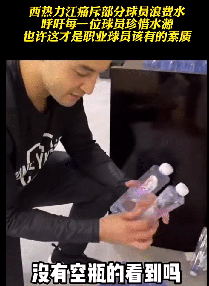 同曦球员西热力江此前拍视频展示给媒体,一边拿一边说“没有空瓶的看到了吗?几乎全有水,你看看就喝这么一点点,抿一口就放这你们是为什么?这是职业球员该干的事吗?就这么浪费。我是新疆人,是喀什的我家乡每年都刮沙尘暴,都干旱,所以我对水特别珍惜,关于浪费水这件事我实在太伤心了,太难了!”
