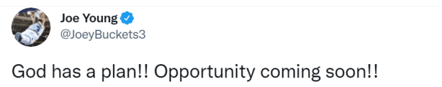 杨本人转发了训练的地点和时间,他预计在当地时间9月25日下午1点在休斯顿举行这次公开试训。他也在社媒上晒出自己的最新训练视频,希望引起更多NBA球队的兴趣。训练时,他穿的是一条猛龙复古球裤。乔-杨写道:“上帝自有安排,机会马上就来!”