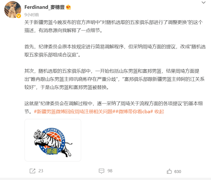 媒体人麦穗丰爆料,起初这5家俱乐部包括山东和富邦男篮但最终退出了!周琦方面提出“睢冉跟山东男篮主帅巩晓彬存在严重分歧”,“富邦俱乐部跟新疆男篮主帅阿的江关系较好”,于是山东男篮和富邦男篮被替换。不得不说周琦团队很厉害,一下子就切中了要害,尽可能让谈判的对方保持中立的立场!