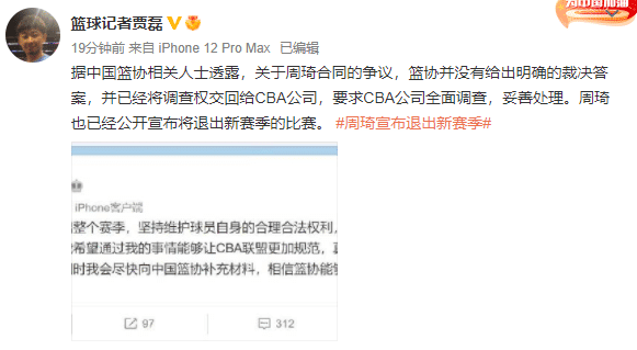 周琦硬刚新疆男篮和CBA规则,也是引发了极大的关注度,知名篮球记者贾磊表示:据中国篮协相关人士透露,关于周琦合同的争议,篮协并没有给出明确的裁决答案,并已经将调查权交回给CBA公司,要求CBA公司全面调查,妥善处理。周琦也已经公开宣布将退出新赛季的比赛。