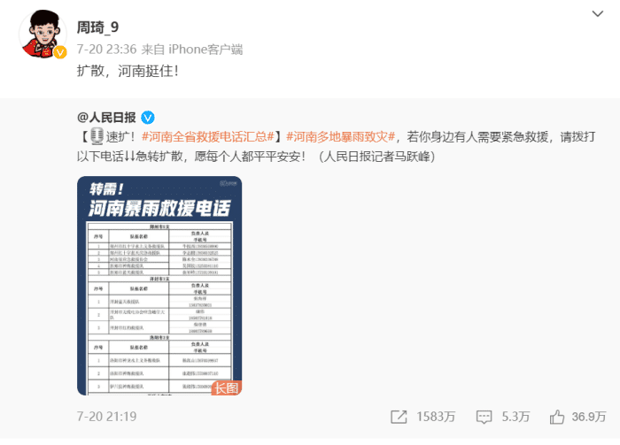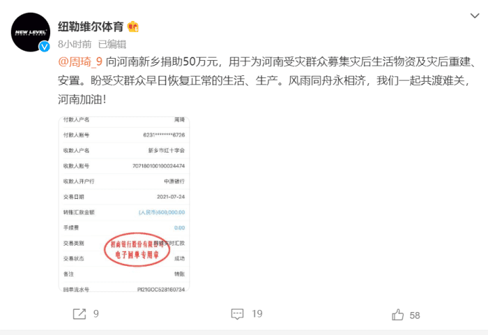 周琦的捐款信息是由经纪公司纽维勒尔体育社媒发出来的“周琦向河南新乡捐赠50万元,用于为河南受灾群众募集灾后生活物资及灾后重建、安置。盼受灾群众早日恢复正常的生活、生产。风雨同舟永相济,我们一起共渡难关,河南加油!”