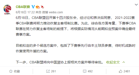 来源:24直播网06-19 11:5224直播网讯 近日CBA公布了第十四次股东会的相关议题,其中就包括了下个赛季恢复主客场制,先由全华班参赛,待时机成熟时恢复使用外援的方案。现在看起来上报的这个方案是很有可能通过的,如果是这样,那么也就意味着下个赛季的CBA联赛,初期是没有外援的,而根据各方的报道显示,如果方案通过,那么全华班预计会打到2月份,全华班至少要在大型国际赛事闭幕前一直执行,也就是到明年2月20日。