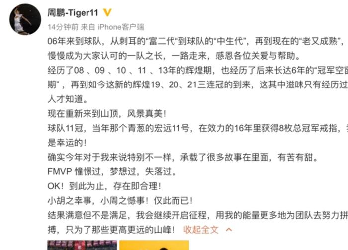 周鹏在自己的社交媒体上表示:“06年来到球队,慢慢成为大家认可的一队之长。一路走来,感恩各位关爱与帮助。16年获得8枚总冠军戒指,我是幸运的。”而随后,周鹏话锋一转,也提到了近期被外界所热议的总决赛MVP人选的争议。周鹏表示:“小胡之幸事,小周之憾事,仅此而已。”无论是广东男篮的主教练杜锋,还是赵睿等球员,都认为周鹏同样具备着获得总决赛MVP的资格。不过正如周鹏所说,胡明轩能够获得这个荣誉,同样是实至名归。