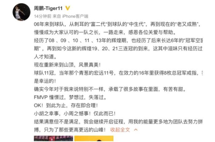 最后在说到总决赛FMVP的时候,周鹏表示:FMVP,憧憬过,梦想过,失落过,OK,到此为止,存在即合理!小胡之幸事,小周之憾事,仅此而已。结果满意但不满足,我会继续开启征程……