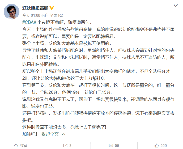 一针见血!辽媒指出输球关键,杨鸣用人值得商榷,最强组合被拆