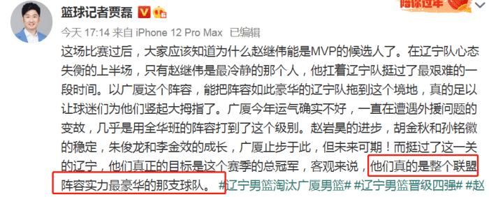 “广厦今年运气确实不好,一直在遭遇外援问题的变故,几乎是用全华班的阵容打到了这个级别。赵岩昊的进步,胡金秋和孙铭徽的稳定,朱俊龙和李金效的成长,广厦止步于此,但未来可期!而挺过了这一关的辽宁,他们真正的目标是这个赛季的总冠军,客观来说,他们真的是整个联盟阵容实力最豪华的那支球队”。