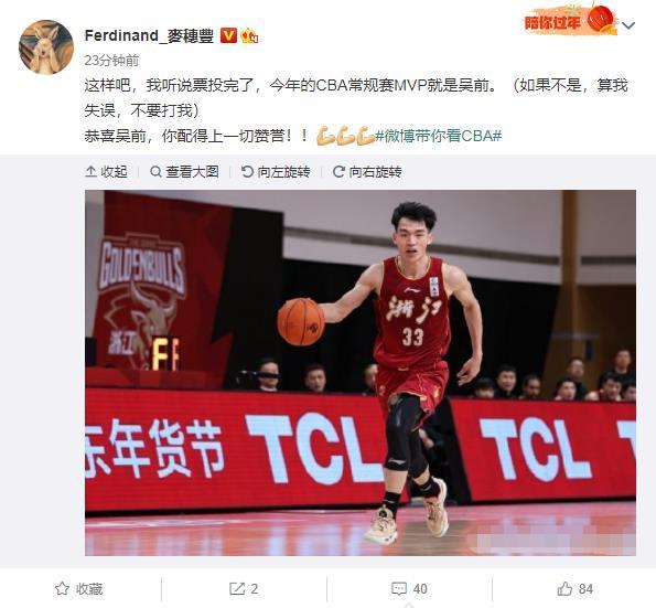 麦穗丰这样说:“这样吧,我听说票投完了,今年的CBA常规赛MVP就是吴前。(如果不是,算我失误,不要打我)恭喜吴前,你配得上一切赞誉!!”