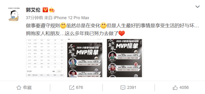 另外球迷也猜测,官方这么做可能是考虑到了近期的“耐克事件”如果郭艾伦最终入选由球迷和媒体人评选为MVP,他的着装将会被热议,篮协很难收场!郭艾伦更新微博“做事要遵守规则,虽然总是在变化,但是人生最好的事情是享受生活的好与坏…拥抱家人和朋友…这么多年我已努力去做了”