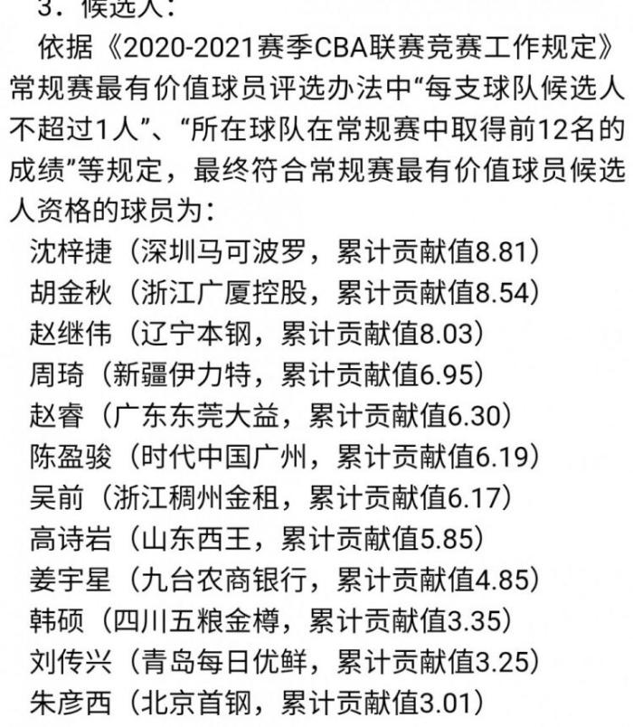 根据CBA官方给出的候选人名单,我们可以看见一共有十二个球员有资格成为MVP,而这个选取的标准居然只是单纯看一个球员对于球队的贡献值,而且只有排在联赛前十二名的球队才可以有球员入选,再加上每一支球队只能拥有一个候选人。这也导致了赵继伟入选而郭艾伦无法入选的尴尬情况发生,因为赵继伟本赛季对于球队的贡献值高达8.03,反观郭艾伦只有6.57。