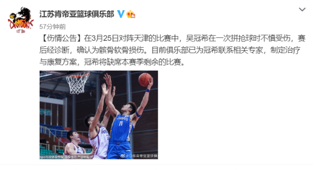 来源:24直播网03-28 16:3824直播网讯北京时间3月28日,来自江苏男篮官方社交媒体的消息,球队主力中锋吴冠希出现,赛季报销。江苏男篮官方写道:“对阵天津的比赛中,吴冠希在一次拼抢球时不慎受伤。赛后经诊断,确认为髌骨软骨损伤。目前俱乐部已为冠希联系相关专家,制定治疗与康复方案,冠希将缺席本赛季剩余的比赛。”