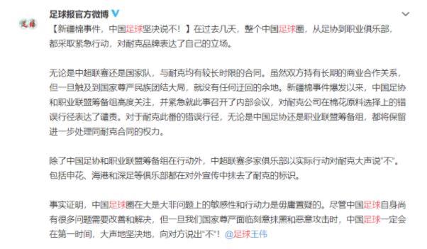 男篮这边的反应让人失望,足协呢?虽然足协发声了,但是依旧让人失望。3月26日,足协发声表示:足协对于耐克的行为进行了谴责,并且保留进一步处理同耐克合同的权利。