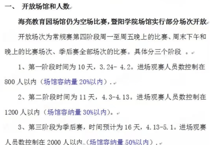 根据记者披露的文件显示,CBA将在第四阶段的常规赛上,正式开放球迷进场观赛。而这一球迷开放计划,也会分为三个阶段循序推进。(只开放暨阳学院场馆,海亮教育园场馆继续空场)