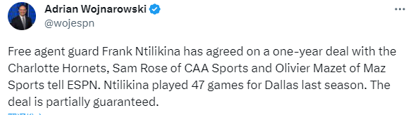 今夏黄蜂正式易主,乔丹卖掉手中的大部分股权,套现30亿美元退为小老板,黄蜂新老板执掌球队后第一笔操作是签约尼利基纳,新赛季三球继续带队冲击季后赛。