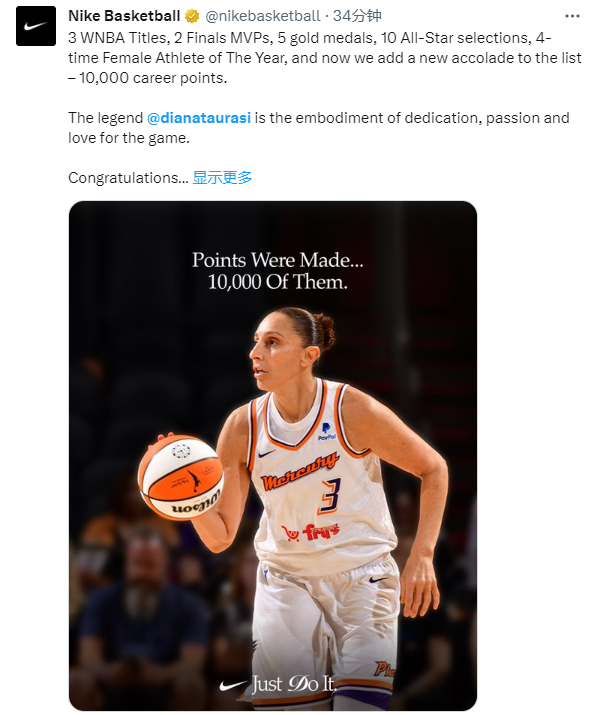 耐克官方祝贺陶乐西,写道:3次WNBA冠军、2次总决赛MVP、5枚金牌、10次入选全明星、4次年度最佳女运动员,现在我们在名单上添加了一项新荣誉——生涯10000分,恭喜传奇。