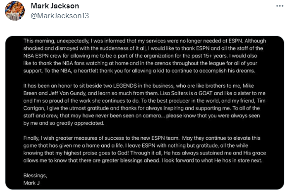 “今天上午,出乎意料的是,我被告知ESPN不再需要我了。尽管对突然发生的这一切感到震惊和沮丧,但我仍然要感谢ESPN和所有工作人员,过去15年里,是ESPN和NBA给了我成为他们当中一部分的机会。我还要感谢在家和来现场看NBA比赛球迷们的所有支持。对于NBA,衷心地感谢你们让一个孩子继续实现他的梦想。