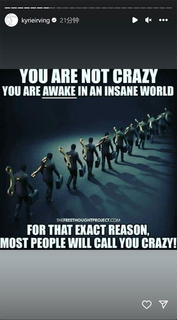 另外欧文还在INS上说了一些话,晒图并写道:“你没疯,你只是在这个疯狂的世界里保持清醒。绝对是因为出于这个原因,大部分人会说你疯了。