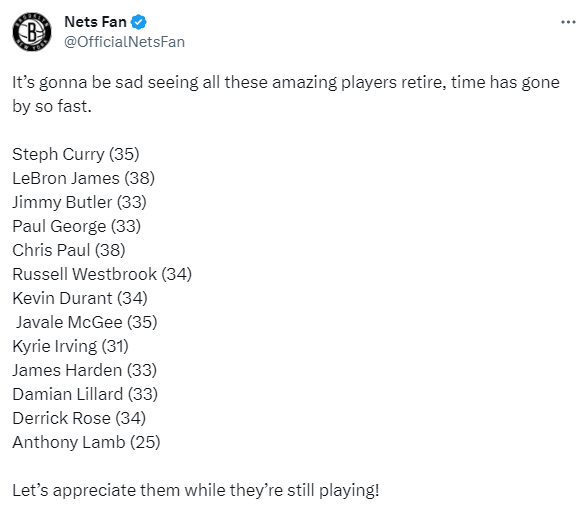 篮网球迷自媒体Nets Fan写道:将来看到这些出色的球员退役真让人难过,时间过得太快了。球员年龄如下——