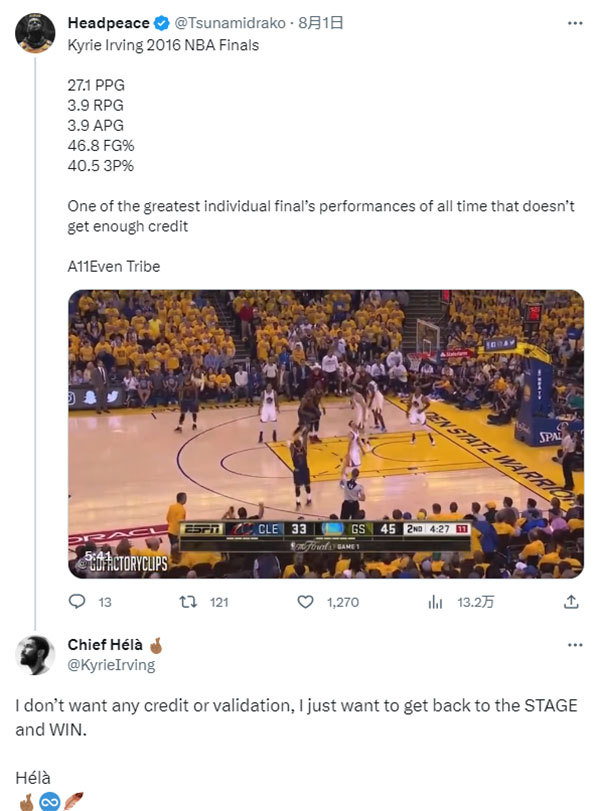 有球迷晒出欧文2016年总决赛的数据:场均27.1分3.9篮板3.9助攻、命中率46.8%和三分命中率40.5%;有史以来最伟大的总决赛个人表演之一,但没有得到足够的认可。