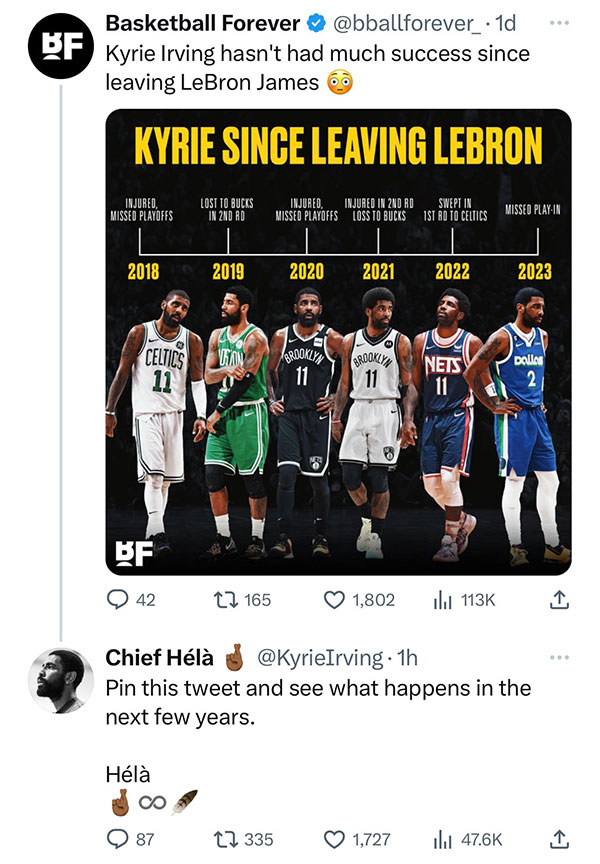 此前美媒Basketball Forever列出欧文离开詹姆斯后的还没有取得成功的数据——2018年因伤缺席季后赛、2019东部半决赛输给雄鹿、2020篮网时期因伤缺席季后赛、2021年在次轮对阵雄鹿时遭遇伤病、2022年季后赛首轮惨遭凯尔特人横扫,2023年独行侠时期无缘附加赛。