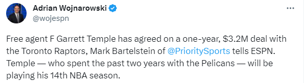 猛龙将成为他职业生涯效力的第12支球队,换言之,坦普尔14年换12支球队,成为仅次于伊什-史密斯换队次数第二多的球员。