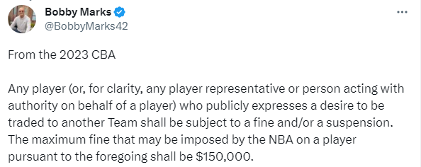 NBA薪资专家Bobby Marks表示,从2023年新的劳资协议开始执行,任何公开表达希望被交易到另一支球队的球员(任何球员代表或代表球员行事的授权人)都将受到罚款或者停赛处罚。 NBA 根据上述规定对球员处以的最高罚款为150000 美元。