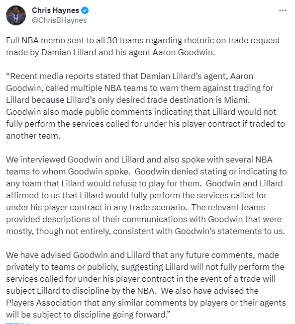 联盟最近与利拉德及其经纪人进行谈话,并会面多支利拉德经纪人警告过的球队,NBA联盟已经向30支球队发送了一份备忘录,表示:我们已经警告利拉德及其经纪人,若未来出现任何与球队私底下的沟通或公开言论谈及利拉德只想被交易到某支特定的球队,利拉德可能将遭到联盟的处罚。我们也告知球员工会,任何球员或经纪人作出的类似行为也可能遭到处罚。
