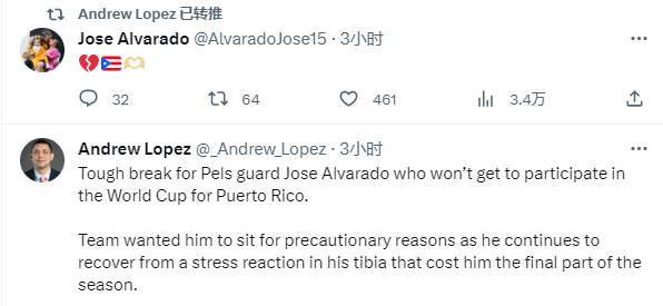 鹈鹕球员阿尔瓦拉多不在名单上,确定缺席世界杯,据鹈鹕随队记者Andrew Lopez报道,阿尔瓦拉多缺席世界杯是因为鹈鹕不让打,上赛季末阿尔瓦拉多胫骨受伤还没有完全好,球队希望他能完全恢复。