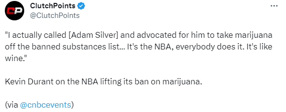 杜兰特回应解禁大麻:致电总裁主张解除禁令 透露联盟每个人都抽大麻