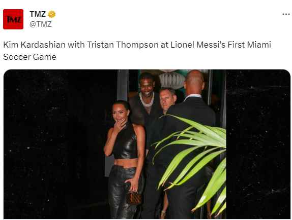 24直播网讯07月23日,据美八卦媒体TMZ报道,NBA球员特里斯坦-汤普森(TT)与其前女友的姐姐金-卡戴珊一起观看梅西的美职联首秀后一起外出去了一家日本餐厅;美媒还爆料他们去夜店喝酒跳舞并狂欢到深夜。