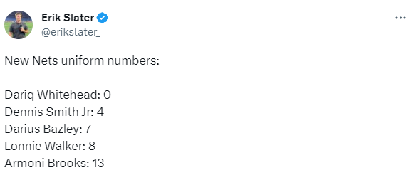 篮网记者Erik Slater报道,篮网多位新援的球员号码出炉——达柳斯-贝兹利7号、怀特黑德改穿0号、小丹尼斯-史密斯4号,朗尼-沃克8号,阿尔莫尼-布鲁克斯13号。