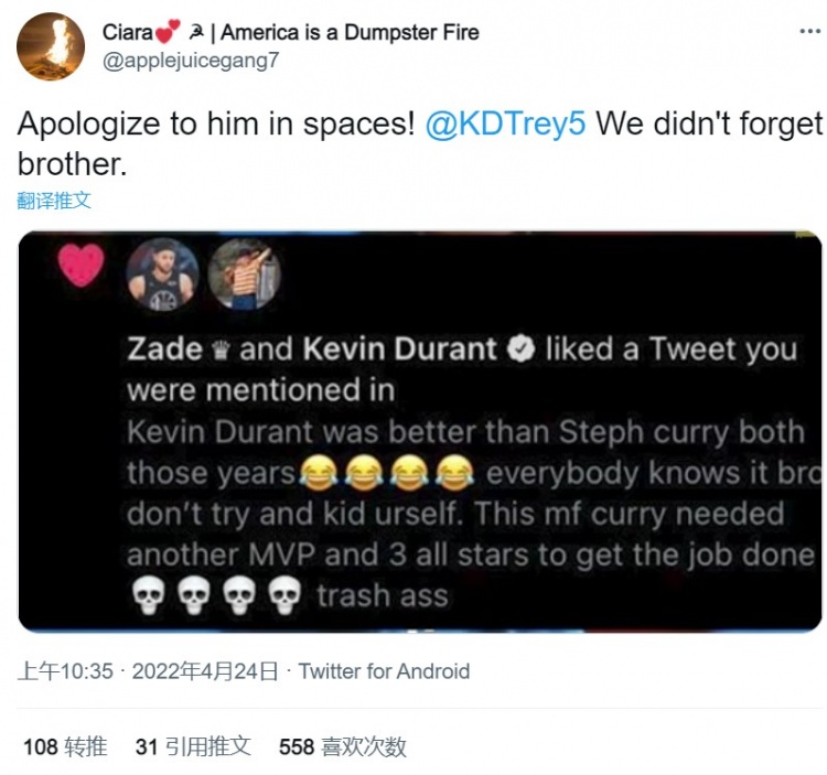 2年前,也就是北京时间2021年4月21日,杜兰特点赞了一条内容为:杜兰特在这些年比库里更好,大家都知道,别试图欺骗自己了。这个王八蛋库里需要再来一个MVP和三位全明星才能帮他夺冠,垃圾”的推文。