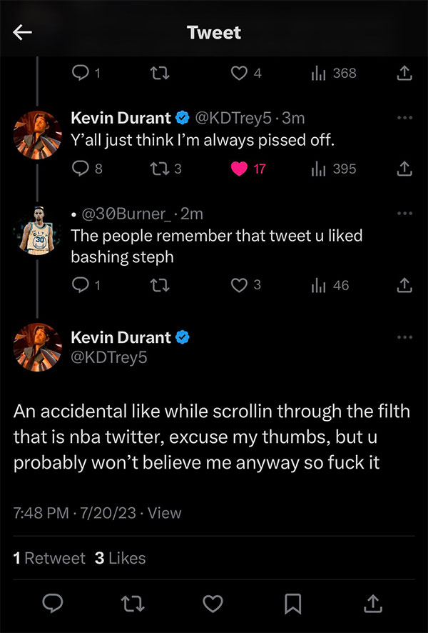 今天,杜兰特和网友聊天的时候聊到了这事,杜兰特发推解释说:那是一个意外的点赞,往下划推特的时候点到的,请原谅我的大拇指们,但你大概也不会相信我的说法,所以,Fxxk算了吧!
