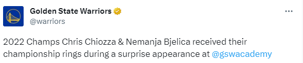 24直播网讯07月20日勇士2022年夺冠成员克里斯-奇奥萨和内马尼亚-别利察正式领取属于他们的总冠军戒指,现场小球迷为他们欢呼,勇士两大旧将展示戒指并且戴上戒指合影留念,2022年NBA总冠军奖杯也在现场。