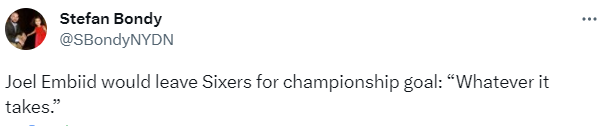 现在恩比德的目标是只有总冠军,未来他会申请离队吗?名记Sam Amick表示76人管理层相信恩比德会像诺维斯基和科比那样终老在费城,他表示:至于恩比德是否可能很快申请离队的问题,一位76人队的高层透露,恩比德或他的经纪人尚未与球队分享任何此类信息。事实上,76人仍然相信恩比德愿意走德克-诺维茨基或科比-布莱恩特的道路,并在整个职业生涯中留在一支球队。