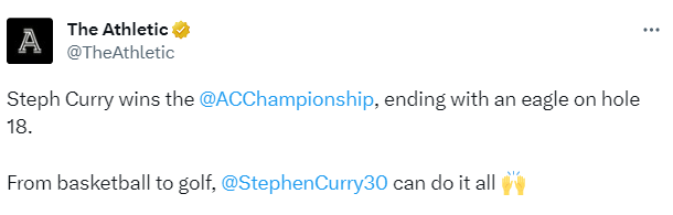 美媒纷纷刷屏祝贺库里,NBA Central发推写道:库里冠军;TA恭喜库里的同时写道:从篮球上到高尔夫赛场,库里真的无所不能。