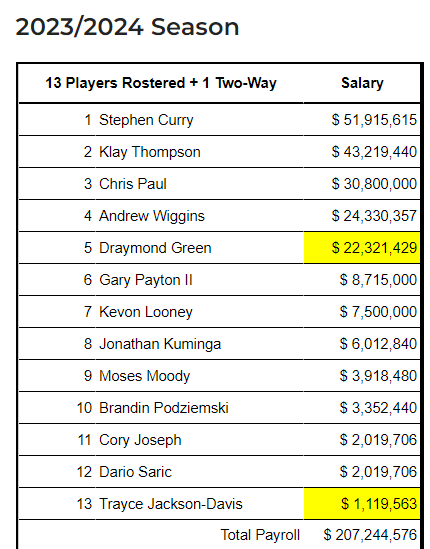 目前勇士队有14名球员——13名保障球员分别是库里(新赛季年薪5191万美元)、汤普森(4322万美元)、保罗(3080万美元)、维金斯(2433万美元)、格林(2232万美元)、小佩顿、卢尼、库明加、穆迪、波杰姆斯基、约瑟夫、萨里奇和杰克逊-戴维斯;1名双向合同球员是贾万-约翰逊。