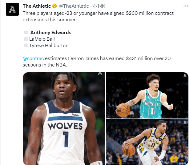 在这12份亿元合同中,5人拿到超过2亿美元的顶薪,2020届状元爱德华兹、探花三球、12号秀哈利伯顿和30号秀贝恩都提前续签超级顶薪,他们四人合同总额最高达到9.87亿美元;爱德华兹、三球和哈利伯顿都是在23岁及以下签下2.6亿顶薪,美媒调侃詹姆斯20年生涯合同总额才4.31亿美元。