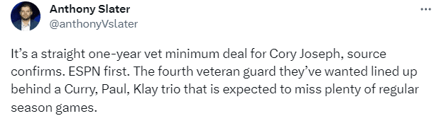 追求戈登失败后,勇士记者跟进报道,勇士用一年老将底薪合同签下约瑟夫,成为勇士队第4位老将后卫,勇士又签后卫是因为库里、保罗和汤普森预计将缺席很多常规赛