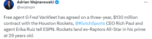 今夏范弗利特拒绝执行最后一年价值2284万美元的球员选项,跳出合同成为自由球员,范乔丹是火箭的首要引援目标之一,据此前报道,火箭退出哈登争夺战,并且专注于追求范弗利特,火箭计划报价2年8360万美元,猛龙倾向于给他3年9000至1亿美元以及4年1.2亿美元。