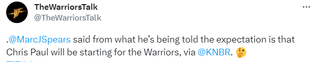 Marc J. Spears在节目中报道,我被告知的情况来看,保罗预计将会首发,该记者表示:如果他(保罗)首发,(勇士的)阵容就会非常小。假设德雷蒙德(格林)回来,那就是他打中锋,维金斯出任大前锋,是的,这在进攻上确实非常强大,但我想知道他们是否最终会决定让克里斯(保罗)打替补,这可能会很尴尬,因为他的整个名人堂生涯至今都没有打过替补。