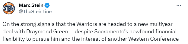 据名记Marc Stein报道,即使国王拥有薪资空间以及另一支西部球队(灰熊)也追求格林,勇士也有强烈的信心和格林达成一份新的多年合同,双方可能达成一份3年合同。