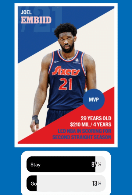 《费城问询报》就休赛期费城球员去留问题发起投票,在恩比德层面,作为新科常规赛MVP,有87%的球迷认为必须留下大帝,这点和此前外媒的报道非常像,那就是恩比德是球队的建队核心,绝对不能动的球员。