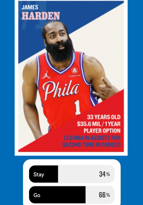 到了哈登这边,很显然费城的球迷们就没有那么友好了,作为球队核心之一、常规赛助攻王,哈登的表现并未征服费城球迷们。在票选中,有超过66%的球迷认为哈登离开76人,这样的占比是很高的。很显然,虽然个人薪水和数据、打法上有牺牲,但费城76人的球迷们依旧认为哈登需要承担责任,今夏的休赛期离开球队。