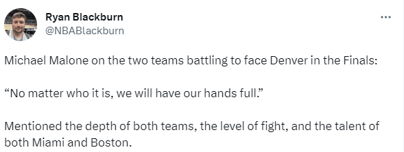 谈到总决赛,马龙盛赞热火凯尔特人的阵容深度和天赋,还表示:无论我们的总决赛对手是谁,我们都有太多的工作要做。