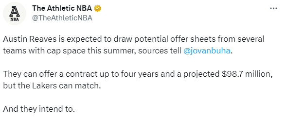 今夏湖人将会全力匹配里夫斯和八村垒的续约合同,其他球队最高可以给里夫斯开出4年9870万美元的合同,湖人可以匹配报价;很明显,其他球队将会抬价争夺里夫斯,若其他球队开出4年将近1亿美元的大合同,这将让湖人十分难以抉择。