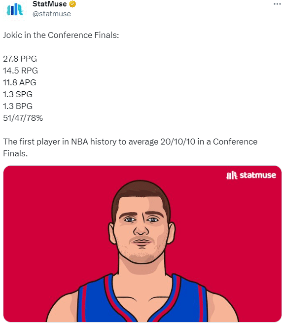西决系列赛,约基奇场均轰下27.8分14.5篮板11.8助攻1.3抢断1.3盖帽,三项命中率分别是51%、47%和78%;约基奇成为NBA历史上首位在单次分区决赛中场均砍下20+10+10的球员;单赛季季后赛8次三双,打破张伯伦保持的历史三双纪录。