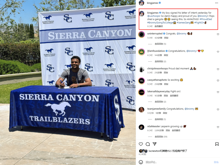 詹姆斯转发布朗尼签约照,并且配文写道:“我儿昨天与南加大男篮签署了择校意向书!太为你感到高兴与自豪了@布朗尼!父亲看到这一幕都落泪了,简直太棒啦! #骄傲的老爹 #,布朗尼要上大学了#詹姆斯帮#FightOn。