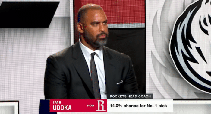 今年各队获得状元签的概率——活塞、火箭和马刺均是14%,黄蜂12.5%,开拓者10.5%,魔术9%,步行者6.8%,奇才6.7%,爵士4.5%,独行侠3%,公牛1.8%,雷霆1.7%,猛龙1%和鹈鹕0.5%;活塞名宿本-华莱士为活塞抽签,火箭安排新帅乌度卡抽签。
