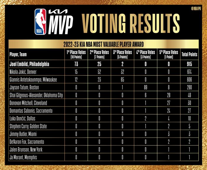在MVP投票结果中,恩比德获得73张第一选票、25张第二选票和2张第三选票,总共915分;约基奇674分和字母哥606分;恩比德完胜约基奇和字母哥,915分联盟第一。